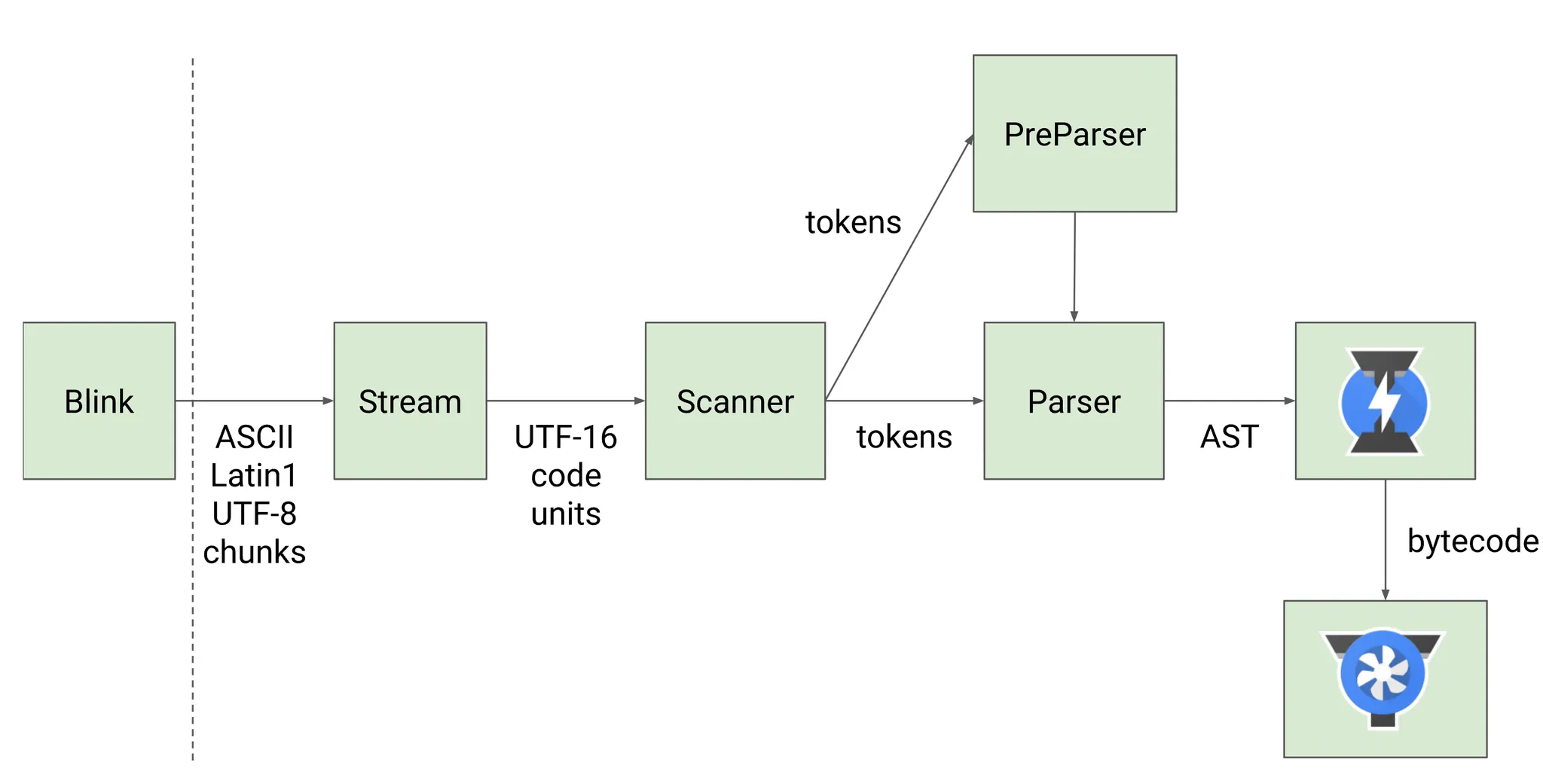 먼저 Blink 엔진이 소스 코드를 ASCII, Latin1, UTF-8 형식의 청크로 읽어들인다. 이 데이터는 스트림$_{Stream}$으로 전달되고, 스트림은 이를 UTF-16 코드 단위로 변환한다. 스캐너$_{Scanner}$는 이 UTF-16 코드 단위를 읽어 의미 있는 토큰으로 만든다. 예를 들어 'function'이라는 키워드나, '+'라는 연산자, 혹은 변수 이름 같은 식별자들이 토큰이 된다.