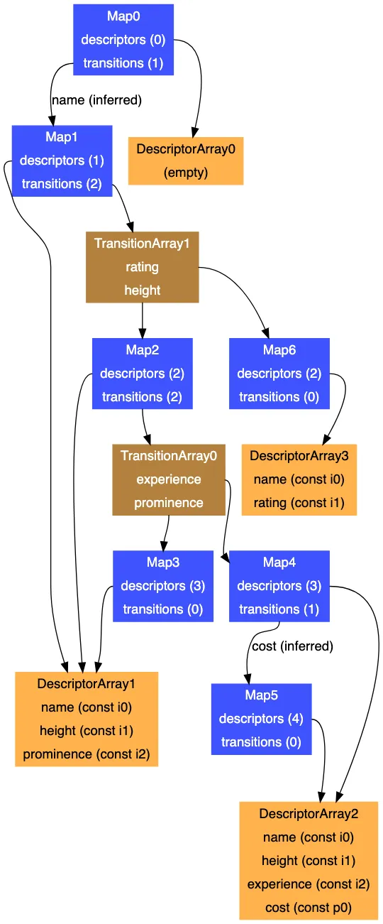 히든 클래스는 DescriptorArray와 TransitionArray라는 두 가지 배열을 사용한다. DescriptorArray는 객체의 프로퍼티 목록과 각 프로퍼티의 정보(위치, 속성 등)를 저장한다. TransitionArray는 객체에 새로운 프로퍼티가 추가될 때 어떤 히든 클래스로 전환되어야 하는지를 추적한다. 예를 들어 빈 객체에 프로퍼티 x를 추가하면 새로운 히든 클래스로 전환되고, 여기에 다시 y를 추가하면 또 다른 히든 클래스로 전환된다.