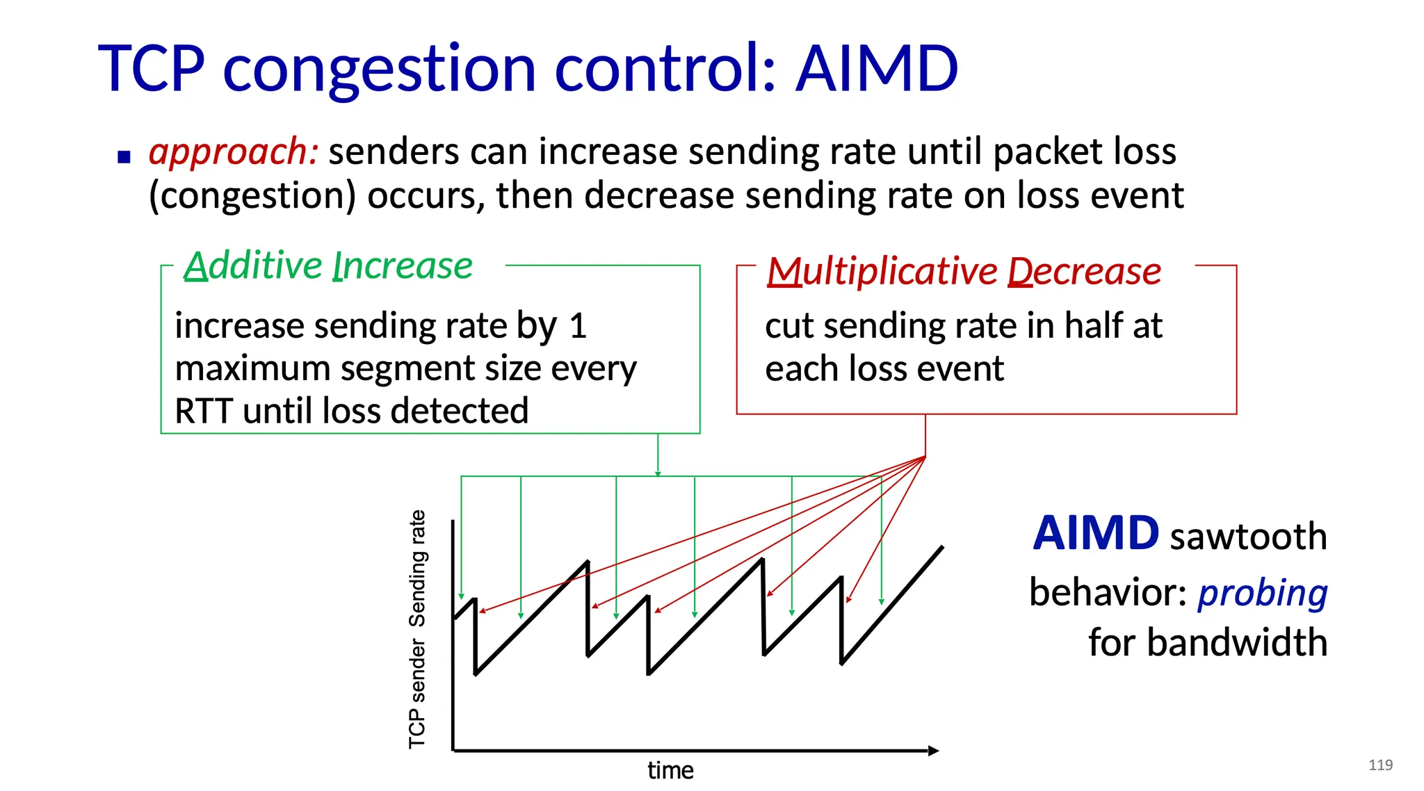 이 방식은 TCP의 전송 속도를 톱니$_{sawtooth}$ 모양으로 변화시킨다. 속도를 점진적으로 올렸다가 혼잡을 만나면 급격히 줄이고, 다시 서서히 증가하는 식이다. 이를 통해 TCP는 네트워크의 가용 대역폭을 조심스럽게 탐색$_{probing}$하게 된다.